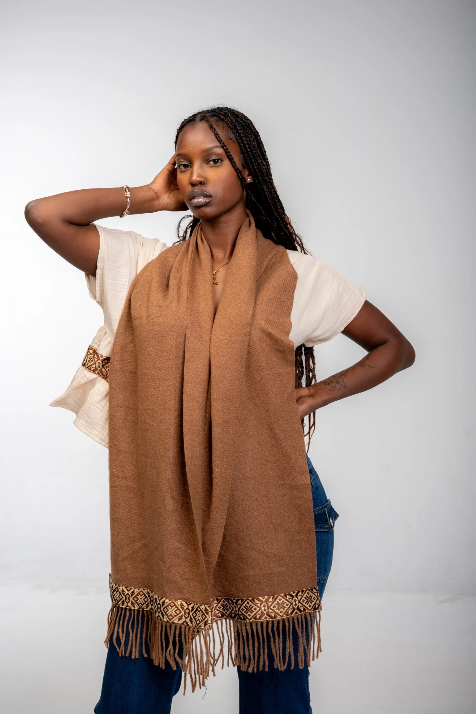 Women › Brown Cotton Scarf with Tassels and Tilet Image 1 of 3 Image 2 of 3 Image 3 of 3 Brown Cotton Scarf with Tassels and Tilet $30.00 Quantity: Add To Cart Added!
